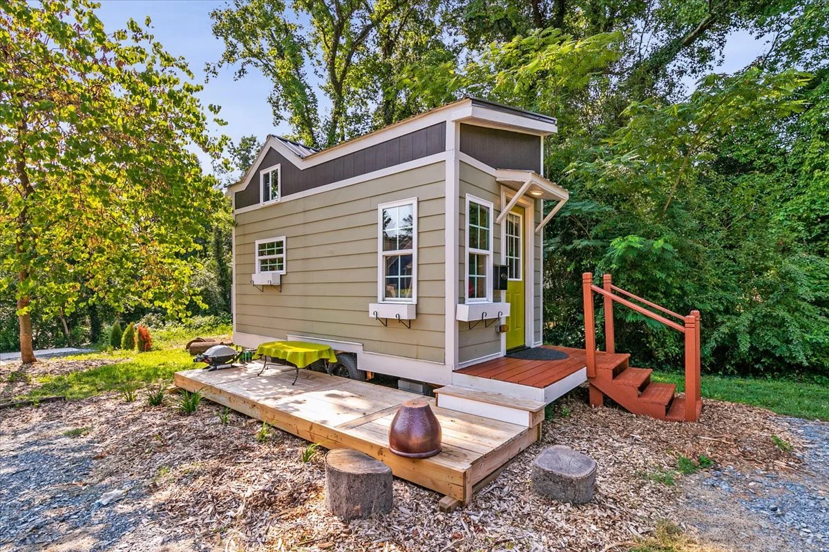 Stay in the Urban Birdhouse Tiny Home in Greensboro, NC — a veteran-built model home from Tiny House Greensboro that once toured trade shows showcasing sustainable ADU living. This eco-friendly rental offers a private deck, lofted queen bed, and walkable access to Downtown Greensboro, Cone Hospital, and local dining.
